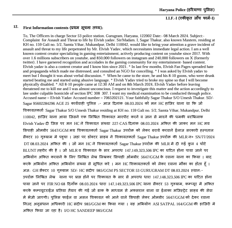 सेक्टर 53 थाना प्रभारी इंस्पेक्टर राजेंद्र कुमार ने बताया कि मूलरूप से दिल्ली निवासी सागर ठाकुर ने शिकायत में बताया कि उसका सोशल मीडिया प्लेटफार्म पर मैक्सटर्न के नाम से अकाउंट है. उसके यूट्यूब, इंस्टाग्राम और एक्स पर लाखों फॉलोअर हैं. वो एल्विश यादव को साल 2021 से जानता है. एल्विश यादव और उसके साथी सोशल मीडिया पर उसकी स्पीच से नाराज थे. मामले में एल्विश ने सागर से मिलकर बातचीत करने के लिए कहा.